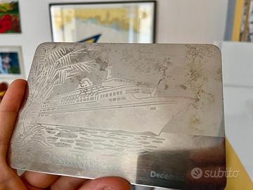 Raro ricordo della stagione inaugurale di Costa Riviera. Inaugurata il 23 novembre 1985 questa targa porta la datazione dicembre 1985, primo mese della sua navigazione caraibica. In acciaio inox, marchiata Sambonet, un pezzo molto bello. Leggermente ossidata ma pulibile senza problemi da mani piu esperte delle mie. Scusate per le foto non particolarmente belle ma essendo specchiata è difficile fotografarla.