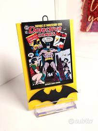 Targa in legno decorata a tema Batman, può essere esposta appoggiandola su uno stand, oppure appesa al muro con il gancetto.