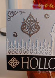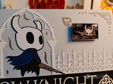 Targa in legno decorativa, ispirata al videogame Hollow Knight! Realizzata con una serie di lavorazioni dettagliate in carta, al centro si trova il cavaliere protagonista del gioco, sul lato destro è invece fissata una targhettina metallica con una sua posa. In basso, realizzato un rilievo il titolo del videogame con un paio di decorazioni ai lati.