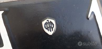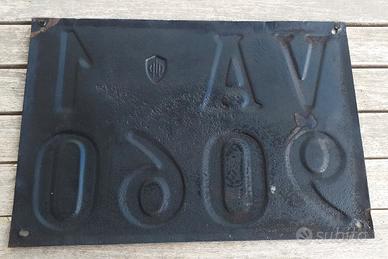 Targa metallica originale italiana estratta degli anni '40 emessa dall'Associazione Mutilati e Invalidi di Guerra, città di Varese. Dal 1944, quando finì il Ventennio e fino al 1948, il simbolo dell'Associazione Mutilati e Invalidi di Guerra fu utilizzato sulle targhe posteriori (sebbene l'associazione avesse prodotto tutte le targhe dal 1927): consisteva in una corona di spine con tre baionette e il ricavato della vendita di queste targhe era, infatti, destinato all'Associazione Mutilati e Invalidi di Guerra. Le dimensioni delle targhe degli anni '40 sono leggermente più grandi di quelle successive, sono circa 12,5 x 8,5 pollici. La targa è stata usata poco e ben conservata, ha subito un molto leggero restauro professionale nel senso che alcuni punti dove la vernice si era un po' deteriorata sono stati ridipinti ma è ovviamente da considerarsi completamente originale. La targa è molto robusta e totalmente intatta. Tutti i fori di fissaggio sono a posto.