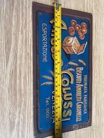 Riproduzione fedele di una storica targa pubblicitaria italiana, realizzata da Hachette, dedicata alla premiata fabbrica Angelo Colussi di Venezia. Il soggetto raffigura una classica scatola di biscotti, amaretti e caramelle, con dettagli vintage e colorazioni vivaci perfette per collezionisti e appassionati di arredamento retrò.