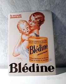 Targa in cartone plastificato che si rifà ad una delle campagne promozionali della Blédine (latte in polvere) della famosa casa farmaceutica francese nata nel 1881.. I due farmacisti fondatori si sono messi alla ricerca di un prodotto che potesse nutrire i neonati che non tollerano il latte. Nasce così nel 1906 la farina di grano tenero in polvere conosciuta con il nome Blédine non conobbe il success Appena il prodotto fu commercializzato arrivarono lettere di ringraziamento. I medici dell'epoca esaltavano le virtù di Blédine e sostenevano che avrebbe salvato i neonati che non tolleravano il latte. Alcuni parlano addirittura di "resurrezioni". La targa si presenta in buono stato con o colori vividi e misura : 20×15 cm