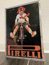 Targa Pubblicitaria in Metallo/Latta, la stampa è stata disegnata da Plinio Codognato per Pirelli, nel 1916. “Un bel bambino in bicicletta, con le gambe larghe e il volto sorridente che pareva scendere per una china venendo incontro a chi lo osservava”. L’Italia è appena entrata in guerra e i colori del vestito del bambino sono quelli della bandiera nazionale. Fa parte della "Le targhe d'Autore" di Ruoteclassiche, rivista di auto d'epoca, splendide riproduzioni in metallo di famose insegne "storiche". Presenta dei fori ai 4 lati da appendere come quadro a parete. Ideale per arredamento vintage, garage design. Misure 24 x 34 cm. Condizioni eccellenti