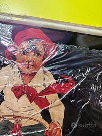 Produzione italiana, prima metà del ’900. Colori ancora ben visibili, grafica molto ricercata dai collezionisti di automobilia e pubblicità storica.