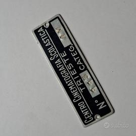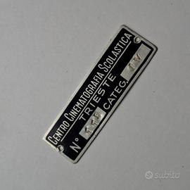 In vendita una splendida e rara targhetta metallica originale d'epoca, proveniente dal "Centro Cinematografia Scolastica" di Trieste. Questa targa è un pezzo autentico di storia della scuola e del cinema italiano, ideale per collezionisti, amatori o per chi desidera un oggetto d'arredamento unico e di carattere. La targa presenta le seguenti incisioni e caratteristiche: Dicitura: CENTRO CINEMATOGRAFIA SCOLASTICA - TRIESTE Numero identificativo: N. 115 Categoria: Categ. IV Materiale: Metallo stampato, con fondo nero e testo in rilievo argentato. Condizioni: Ottime condizioni vintage, con una patina del tempo che ne esalta l'autenticità. Presenta due fori alle estremità per l'affissione. Dimensioni: Lunghezza circa 11 cm (vedi foto con metro per riferimento preciso). Come mostrato nelle foto (frontale, angolazioni varie e retro), la targa è ben conservata e i caratteri sono perfettamente leggibili. Perfetta come regalo originale per un appassionato di cinema, storia locale di Trieste o modernariato. Disponibile a spedire o ritiro a mano a Trieste