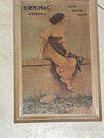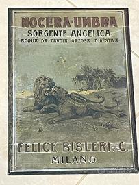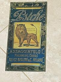 Set di quattro targhe pubblicitarie in metallo, con design vintage. - Targa Psiche con leone e scritte Assaggiatelo e Felice Bisleri & C. Milano. - Targa Nocera Umbra Sorgente Angelica con leoni e Felice Bisleri C. Milano. - Targa Birra Ichnusa. - Targa S. Venchi & C. Torino con immagine di donna.
