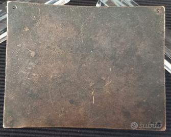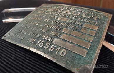 Targa di una vettura RENAULT KZ (anni '20 e '30), 4 cilindri, matricola 155510 e proveniente dagli stabilimenti Renault Billancourt (Senna, Francia). Piatto in ottone, circa 7 cm X 9 cm, leggermente bombato.