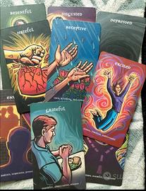 Il cofanetto si presenta in una scatola di cartoncino rigido e contiene una guida di 96 pagine, 60 émotion cards, 12 carte istruzioni e 5 carte bianche se desideri arricchire il mazzo con le tue emozioni.