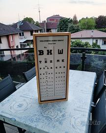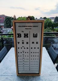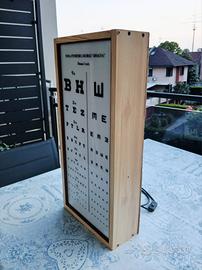 Vendo tavola ottometrica Armaignac luminosa anni '70, nota anche come ottotipo, comunemente utilizzata dagli oculisti e dagli ottici per misurare l'acutezza visiva (la capacità dell'occhio di distinguere i dettagli). Nello specifico, questa è una Tavola Ottometrica Decimale "Armaignac" progettata per essere utilizzata a una distanza di 3 metri. La tavola è divisa verticalmente. A sinistra contiene lettere dell'alfabeto (ottotipi letterali), mentre a destra contiene la "E" di Albini, orientata in diverse direzioni, utile per i pazienti analfabeti o per i bambini che non conoscono ancora le lettere. Sul lato sinistro di ogni riga sono indicati i decimi (es. 1/10, 2/10, fino a 10/10). Revisionato l'impianto di illuminazione interna che funziona perfettamente e non "sfarfalla". Misure 70x32x13. Bellissima anche come oggetto vintage di arredo. Non spedisco...consegna su Milano e hinterland o Monza e Brianza. Contattami per info!