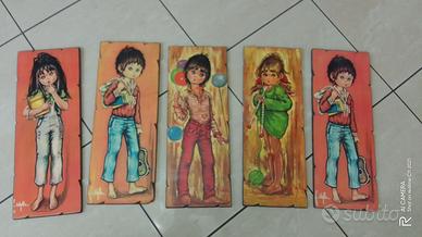 Le stampe fanno parte del movimento artistico "Big Eyes" (occhi grandi) degli anni '60 e '70, che raffigurava bambini con occhi grandi e commoventi. Questi pezzi sono considerati "kitsch" e hanno un valore da collezione. vendo lotto completo