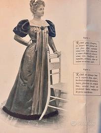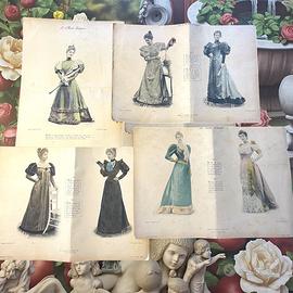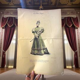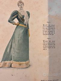Eleganti figurini originali pubblicati nel 1893 sulle pagine di La Mode Pratique, una delle riviste più influenti della Parigi fin de siècle. I modelli portano la firma dell’atelier Madame Moslard, rinomato in rue Saint-Lazare, cuore pulsante della moda parigina, dove sartorie e case di moda anticipavano i gusti dell’élite borghese. Le tavole sono 4:una grande singola e 3 doppie, stampate con la tecnica dell’eliocromia Deniau, un raffinato procedimento litografico che permetteva di ottenere colori delicati e sfumati, anticipando quasi l’effetto fotografico a colori. Ogni illustrazione è una finestra sulla Belle Époque, con i tipici costumi dell’epoca: maniche a gigot ampie e teatrali, corpetti stretti a sottolineare la vita, sete e velluti riccamente drappeggiati, dettagli di pizzi e nastri che raccontano l’eleganza di un’epoca sospesa tra tradizione e modernità. Nelle doppie l’intestazione è tagliata, ma per chi desideri incorniciarle non è un difetto. Infatti oltre al valore storico e collezionistico, queste tavole hanno un fascino decorativo intramontabile: incorniciate, diventano quadri capaci di restituire alla casa la grazia e la raffinatezza della Parigi ottocentesca.