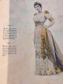 La Mode Pratique, Librairie Hachette, Parigi, 1893. Atelier: Madame Moslard, rue Saint-Lazare, Parigi. Tecnica: eliocromia Deniau (cromolitografia a colori, precorritrice della stampa fotografica). 1 tavola singola integra + 3 doppie con intestazione parzialmente tagliata. Abiti femminili da passeggio e da ricevimento, tipici della moda 1890, con maniche gigot, sete broccate, velluti, jabot di pizzo, dettagli in mousseline e nastri. Valore: testimonianza autentica della moda Belle Époque.