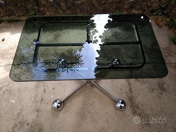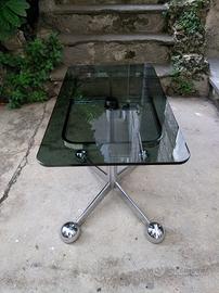 Tavolino da caffè design space-age di Allegri di Parma, prodotto negli anni '70 - '79, regolabile in altezza, piano in cristallo fumé misure 39x68cm, struttura in acciaio cromato con base a 4 sfere con ingombro 55x44cm, altezza minima 50cm, max circa 85cm.