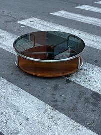 Tavolino da caffè anni 70 su ruote, piano in vetro fumè e struttura in acciaio cromato con base in legno di noce. Costi di spedizione da concordare
