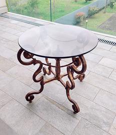 Tavolino da caffè degli anni ’70, piedi in ferro pieno battuto dipinti a oro e riccioli. Piano di vetro tondo fumè. Forma e proporzioni armoniche e fascino retrò. Altezza 57 cm, diametro vetro 60 cm, ingombro max piedi 65 cm.