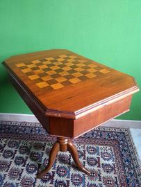 Vendo grazioso tavolino vintage in legno con scacchiera finemente intarsiata sul piano , supporto tornito con tre gambe a sciabola e cassettino porta - pezzi .