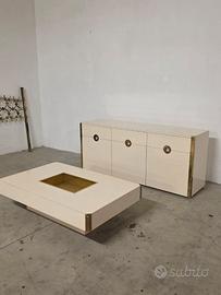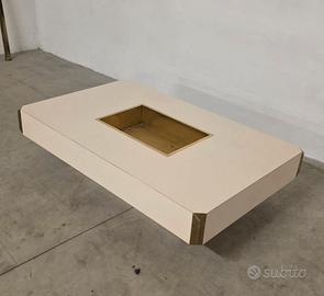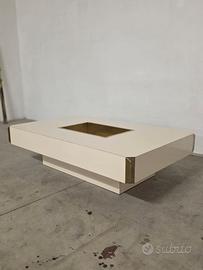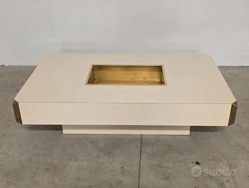 Tavolino serie Alveo Willy Rizzo. Raffinato tavolo basso della serie Alveo. Nella rarissima versione color avorio con dettagli in ottone con fioriera centrale. Disegnato da Willy Rizzo, designer e fotografo italiano, che visse gran parte della sua vita in francia. I suoi arredi sono sinonimo di lusso e stile. La sua carriera alterna momenti da designer a momenti in cui si dedica completamente alla fotografia. Nel 1968 apre un proprio studio e fabbrica a Tivoli che rimane attivo solo fino al 1968. Molti suo arredi sono esposti al Metropolitan Museum di New York. Il tavolo è originale degli anni 70' e si trova in condizioni perfette, minime tracce d'uso, nessun restauro eseguito Gli ottoni saranno lucidati su richiesta. Disponibile nel nostro shop anche la credenza in coordinato. MISURE: Altezza 34 cm, larghezza 128 cm; profondità 80 cm