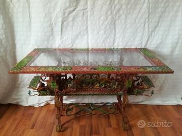 Il tavolo (Misure 116cm x 56cm) è in legno e ferro battuto decorato a mano, raffigurante le classiche scene di cavalleria ecc, con il pianale in vetro.