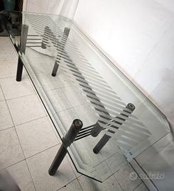 Elegante tavolo databile tra gli anni ’60 e ’70, caratterizzato da un piano in cristallo molato con angoli smussati e lavorazione decorativa satinata