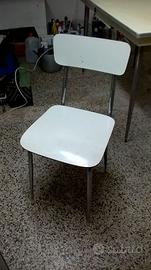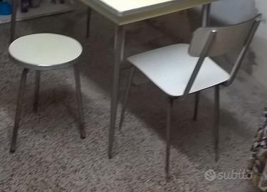 Tavolo, sgabello e sedia in formica degli anni ’60, tutti originali. Sono oggetti che hanno fatto la storia e che oggi vengono copiati e riprodotti dalle aziende mobiliere. Il tavolo misura 70 cm. x 120 x 80 (h). Lo sgabello è della stessa serie del tavolo (stesse rifiniture e medesima tonalità di giallo), la sedia no ed è di un colore leggermente più chiaro. Il prezzo è riferito ai tre oggetti venduti insieme.