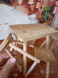 Tavolo+4 treppiedi in miniatura realizzato a mano col legno di ulivo. Il posto ideale è vicino un camino, ma si possono mettere ovunque, anche nella scenografia di un presepe.