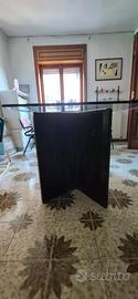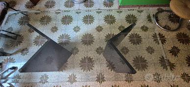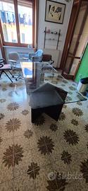 tavolo 80 x 175 cm con due basi triangolari in marmo nero ed un vetro molato superiore.