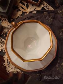 Pezzo estremamente interessante, l'influenza dello stile Art Déco '20 e '30, caratterizzato da forme geometriche e linee nette, ha avuto un impatto duraturo sul design delle porcellane, inclusi i bordi ottagonali dorati, che rappresentano perfettamente quel ponte estetico tra il rigore geometrico dei primi del Novecento e l'eleganza prodotta negli anni successivi, rendendolo un pezzo di storia del design europeo.