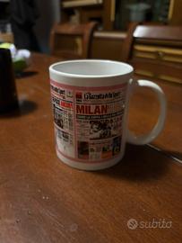 Tazza celebrativa dedicata all'AC Milan, con grafica ispirata a La Gazzetta dello Sport. - Design unico con immagini e titoli di giornale. - Perfetta per gli appassionati di calcio e del Milan.