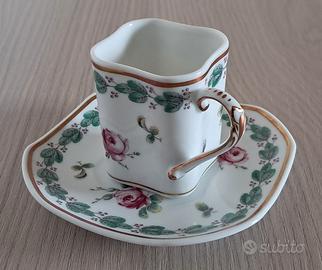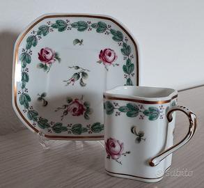 Tazza da caffè con relativo piattino in porcellana Richard Ginori Manifattura di Doccia Firenze. Decoro: ,,Lodi" roselline e foglie verdi di alloro. Tazza altezza 5,5 cm, piattino misura 10,5x10,5 cm.