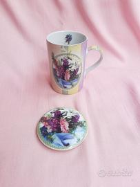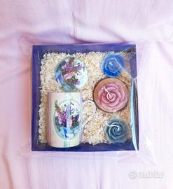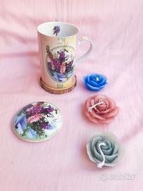 #set tazza da te con coperchio e candele #tazza mug colorata #tazza rosa lilla viola #tazza con coperchio con fiori viola
