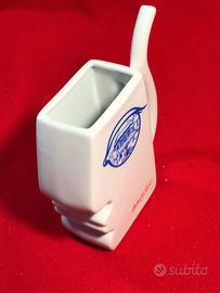 Particolare tazza da collezione in porcellana bianca con manico e cannula per bere, di fattura tedesca. sagomata a parallelepipedo con profilo di volto umano con grafica in blu e rosso. come da foto in perfetto stato. misure generali cm. 4,4x13x13,5.
