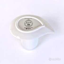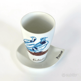Questo pezzo fa parte della celebre linea di porcellane artistiche prodotta dall'italiana Tognana su licenza ufficiale della Succession Picasso e distribuita a partire dai primi anni 2000. Soggetto: Riproduce l'opera grafica "Hortensia et Juan" del 1961. Il disegno raffigura una coppia di piccioni (Hortensia e Juan), un tema ricorrente nella produzione di Picasso di quell'anno, spesso associato alla pace e alla natura. La decorazione si distingue per l'uso di linee nere sottili e tocchi di colore pastello (azzurro e marrone per i rami), che mantengono l'aspetto del tratto a matita o gessetto dell'originale. Caratteristiche di Autenticità: Firma "Picasso" e data "1961" riprodotte sul corpo della tazza. Il fondo reca il marchio Tognana e i riferimenti della licenza MMI (Museum Masters International). La tazza e il piattino sono originariamente fissati l'uno con l'altro, costituendone un unico pezzo.
