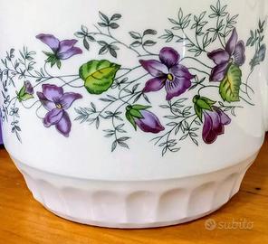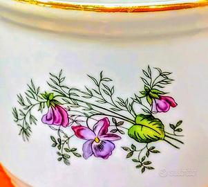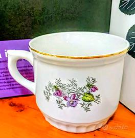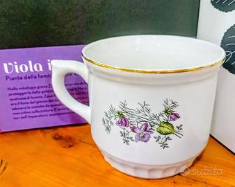 Tazza solida e capiente in porcellana dura con violette in transferware Marchio Dubi, Czechoslovakia . Ottime condizioni. Bordo cm 10 altezza cm 9