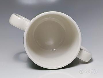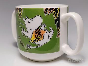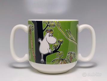 Tazza da collezione dei Moomin o Mumin o Muumit della collezione Jungle di Arabia Finland. Ritrae l'amatissimo personaggio Moomintroll vestito da Tarzan mentre si diverte con le liane tra gli alberi nella giungla. Acquistata nel 2012. Fuori produzione. In fine porcellana Arabia Finland. Versione ormai rarissima con due manici. Perfetta. Per collezionisti dei Moomin ( Tove Jansson ) e amatori del mondo cartoon. Misura cm. 7x7hx12(compresi i manici)