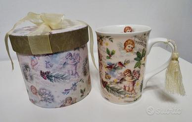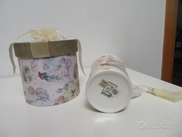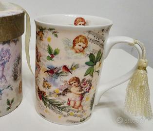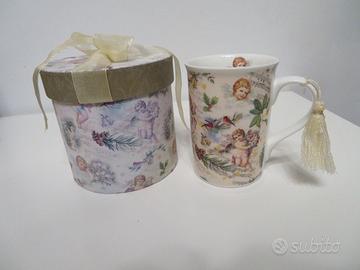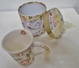 Tazza mug elegante, con motivo di angioletti e con nappina sul manico, completa di scatola in confezione regalo. Articolo nuovo, mai usato, esposto solo in vetrina. #idearegalo