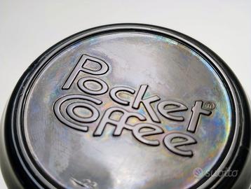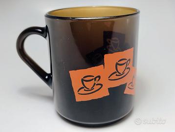 Tazza mug pubblicitaria Pocket Coffee Ferrero. In vetro fumè con tazzine stampate in rosso che evocano il caffé contenuto nei famosi cioccolatini Pocket Coffee della Ferrero, famosissimo marchio italiano. In altorilievo termoformato sul fondo il logo Pocket Coffee. Vintage.