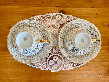 Set di due tazze e piattini da tè in porcellana Seltmann Weiden Anita, decorati con un motivo floreale dorato. Ottime condizioni.