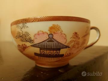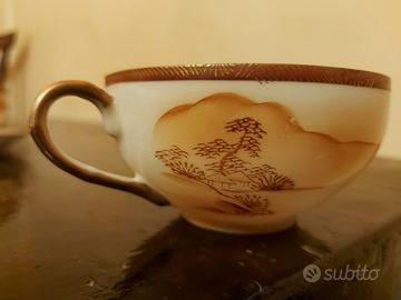 In finissima porcellana, dipinte a mano con motivi orientali e striature dorate.