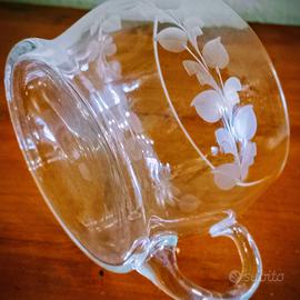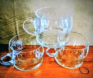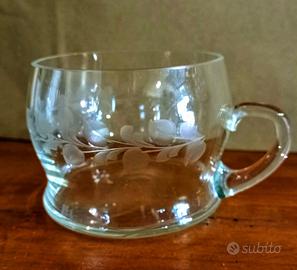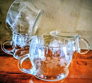 Set hand etched blown glass punch cups . Art deco style.// SET 4 tazze da punch in vetro chiaro soffiato con decoro floreale inciso a mano. Anni 40 ca. Ottime condizioni. Vedi foto – larghezza con manico cm 10 bordo cm 7 altezza cm 6