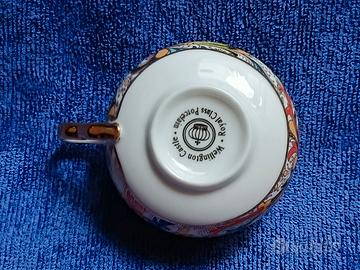 Set tazzina vintage da tè o caffè con piattino in pregevole porcellana vintage Wellington Castle Royal Class, con motivi floreali e dettagli finemente dorati con oro zecchino su tutta la superficie. Usata ma in ottime condizioni. Nessuna scheggiatura o crepa. Lievi segni di usura vintage qua e là, ma niente di particolarmente evidente. La tazza è piccola come una tazzina da caffè, con un bordo di 6,3 cm di diametro (diametro max 7 cm), è alta 5 cm e contiene un volume di circa 100 ml. Il piattino ha un diametro di 10,7 x h2 cm. Peso del set tazza + piatto: 122g.