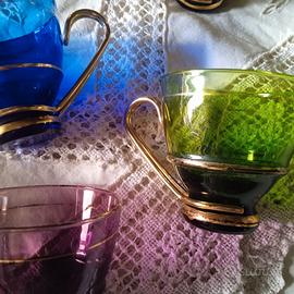 N 7 Tazzine in vetro soffiato colorato 3 fili in oro zecchino con manico in ottone amovibile. Vintage anni 60.