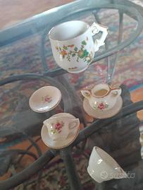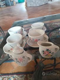 2set tazzine di ceramica per bambine un set 4 tazzine 3 piattini +uno leggermente diverso,lattiera ed un altro bricco l'altro set bordo oro mini 2 tazzine(1 senza stampa fiore) e2 piattini + lattiera con piattino un altro bricco