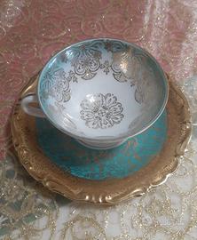 Coppia di tazzine in fine porcellana esclusiva di marchio Rosenthal Selb-Germany Pompadour e Bavaria Kunst Kronach (vedi foto), finemente decorate in blu cobalto, oro zecchino e verde smeraldo con motivi in stile Art-Deco di inizio '900 del secolo scorso. Made in Germany, provenienti da collezione privata e in eccellenti condizioni, mai usate.