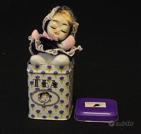 Mini bambolina Tea con la testa in ceramica, della ditta Lineatoy anni '80 custodita in scatolina di latta il tutto molto ben conservato. Molto rara.