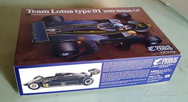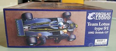 Fedele riproduzione della Lotus 91, in scatola di montaggio, scala 1:20, realizzata da Team Lotus per la stagione 1982. La Type 91 è stata pilotata da Nigel Mansel e dal nostro Elio De Angelis nella stagione 1982, Nigel Mansell si è classificato terzo nel GP del Brasile. Il modello riproduce fedelmente, la versione che ha partecipato al GP Inglese, pneumatici in gomma sintetica con il logo pre-stampato ed i dettagli del telaio forniscono al modello un’elevata qualità.