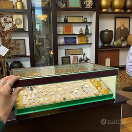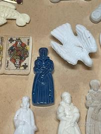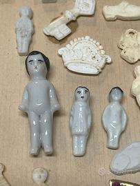 ✨ Un piccolo teatro di porcellana e gesso! Dalla Francia arriva questa teca affascinante, un piccolo mondo in miniatura dove ogni figura sembra raccontare una storia diversa. Al suo interno sono custodite decine di fèves, minuscole figurine in porcellana o gesso che, secondo la tradizione francese, venivano nascoste all’interno della galette des rois, il dolce dell’Epifania. Chi trovava la fève diventava il “re” o la “regina” della giornata — da qui il nome “fève dei re”. Nel tempo, queste piccole sculture sono diventate oggetti da collezione amatissimi in Francia: ogni anno ne venivano create di nuove, dedicate a santi, simboli, mestieri, animali o personaggi popolari. La teca che vedi raccoglie oltre settanta fèves eterogenee per epoca e materiali, in un insieme armonioso e poetico. Ci sono bamboline “Frozen Charlotte” ottocentesche, figure religiose, simboli devozionali come mani votive o cuoricini, e poi esemplari moderni legati alla conquista del cielo e dello spazio, come quelli con la scritta “Concorde”, “Satellite” e “Apollo”, tipici degli anni ’60 e ’70. Ogni piccolo soggetto, incollato con cura su fondo neutro, diventa parte di una mappa emotiva e culturale che attraversa un secolo di vita quotidiana e di sogni collettivi. La cornice dorata, decorata artigianalmente, completa la composizione come una vetrina d’altri tempi, trasformando una semplice raccolta in un piccolo reliquiario della memoria popolare. Un oggetto curioso e poetico, capace di racchiudere in pochi centimetri tutto l’incanto della cultura francese e della sua dolce tradizione dell’Epifania. Le dimensioni della teca sono 39 x 26 cm. Spedizione accurata.