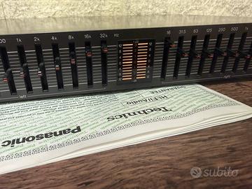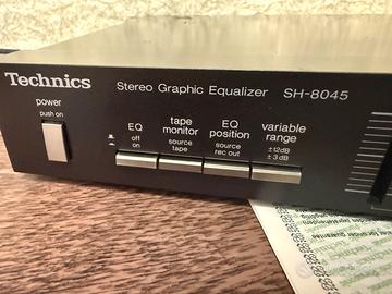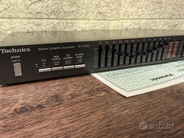 TECHNICS SH-8045 🌈RaRe🌈 Equalizzatore grafico stereo Technics SH-8045 Equalizzatore grafico stereo (1982-88) Prodotto usato in ottime condizioni. Perfettamente funzionante Specifiche tecnicheSensibilità d’ingresso: 1V (8V max) Livello di uscita: 1V (8V max) Guadagno: ± 0dB Risposta in frequenza: Da 5Hz a 100kHz Rapporto segnale/rumore: 100 dB Distorsione armonica totale: 0.005% Separazione dei canali: 70dB Gamma di controllo: ± 12dB Bande di frequenza: 16, 31,5, 63, 125, 250, 500, 1K, 2K, 4K, 8K, 16K, 32KHz Dimensioni: 430 x 53 x 235 mm Peso: 2,6 kg