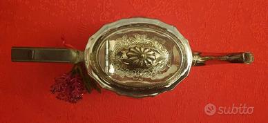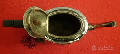 Vendo raffinata teiera antica, realizzata in argento Sheffield e caratterizzata da elaborate incisioni a sbalzo con motivi floreali e volute. Metodo di produzione inglese (nato nell'omonima città) che consiste nel laminare a caldo l'argento. Presenta una ricca decorazione cesellata e a sbalzo, con baccellature sulla base e motivi a ghirlanda sul corpo. Il manico è in materiale isolante sagomato, una caratteristica comune nelle teiere della fine del XIX secolo per evitare scottature. Il coperchio è sormontato da un pomello decorativo coordinato. Lo stile è coerente con la produzione inglese di epoca vittoriana o dei primi del XX secolo (1890-1910 circa). Conservato con la sua scatola originale rivestita e certificato d'acquisto per garanzia di originarietà in gioielleria.