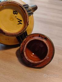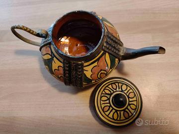 Teiera decorativa in ceramica e metallo con un design etnico.
