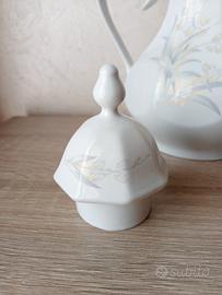 Caraffa ottagonale in porcellana finemente decorata. Circa anni 80. Condizioni eccellenti, pari al nuovo, nessun difetto. Altezza massima: 25 cm. Made in Italy. Tognana.